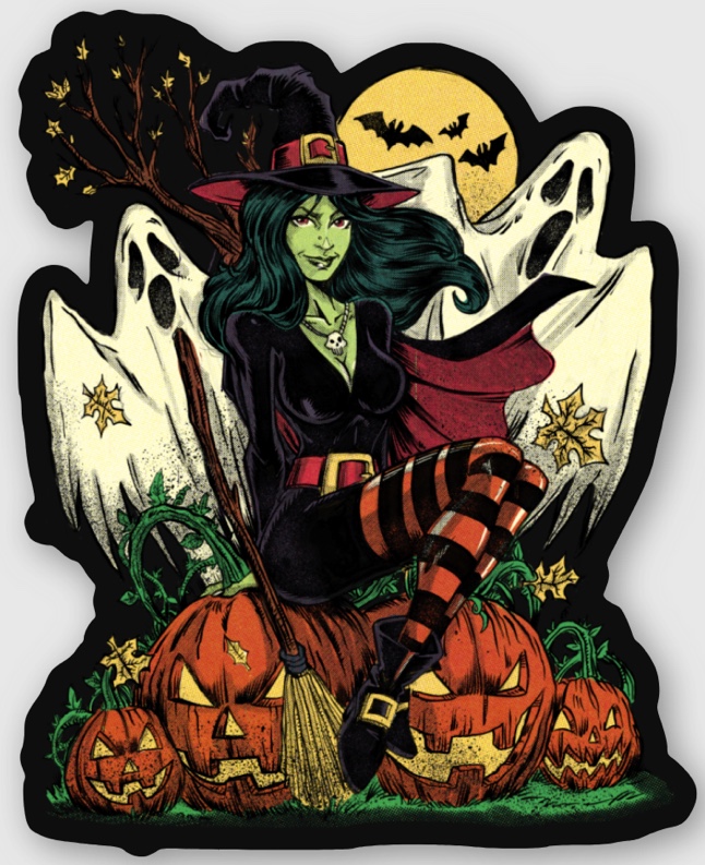 BASED ON THE DOA CO. HALLOWEEN 2020 TEE DESIGN by PUIS CALZADA.... NOTHING SAYS HALLOWEEN LIKE PUMPKINS, GHOSTS, BATS, FULL MOON & a PINNUP WITCH!!!